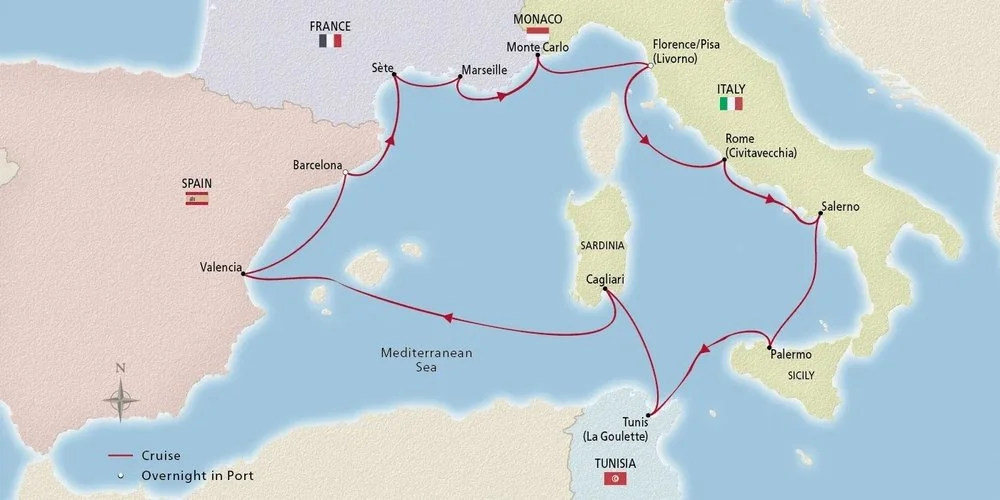 Explore the famed landmarks of Italy, Tunisia, Spain and France as you embark on a voyage through the Mediterranean Sea. See Palermo’s UNESCO World Heritage Sites in Sicily, trace the stunning Amalfi Coast and immerse yourself in Sardinian culture. Sail to Tunisia’s vibrant La Goulette, call at historic Valencia, visit glamorous Monte Carlo and stroll the streets of colourful Sète. Overnights in Barcelona and Florence allow you to explore more.